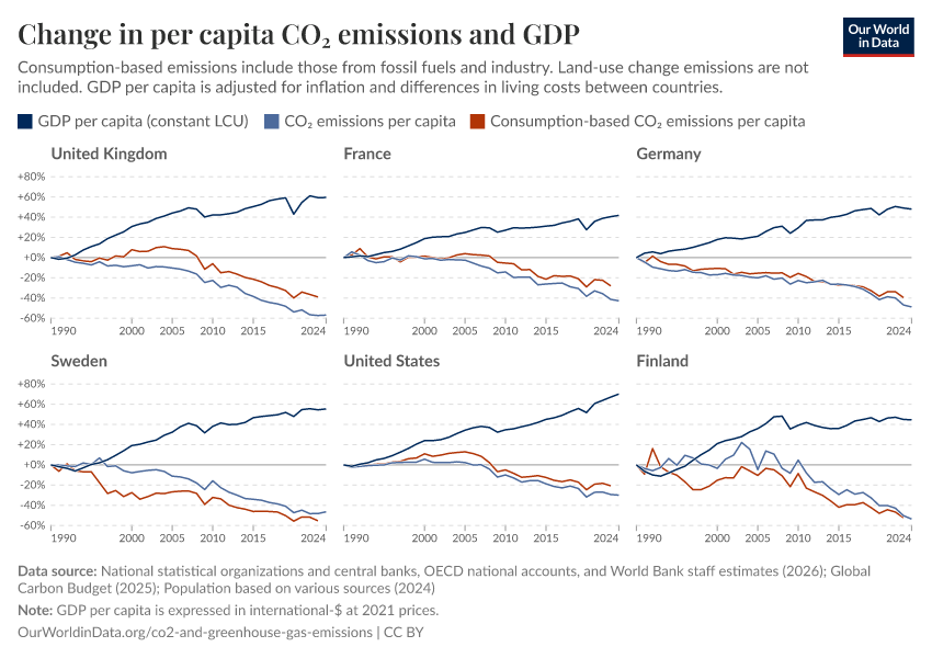 Take the UK as an example. It is shown in the chart. This chart shows the change in GDP and annual CO2 emissions per capita since 1990. We see that the UK’s GDP has increased a lot over the last 30 years while its emissions have fallen. You can also see the data without per capita adjustments.