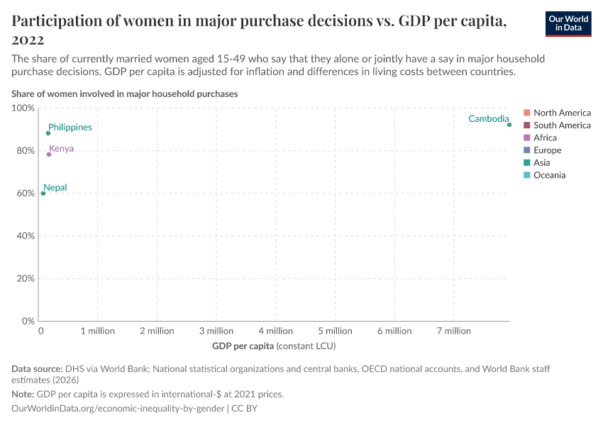 In this chart, we plot the share of currently married women who report having a say in major household purchase decisions, against national GDP per capita.