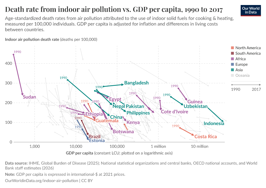 The world is solving this problem. We see this in the chart. Strong economic growth made people around the world richer, and the death rate from indoor air pollution declined.