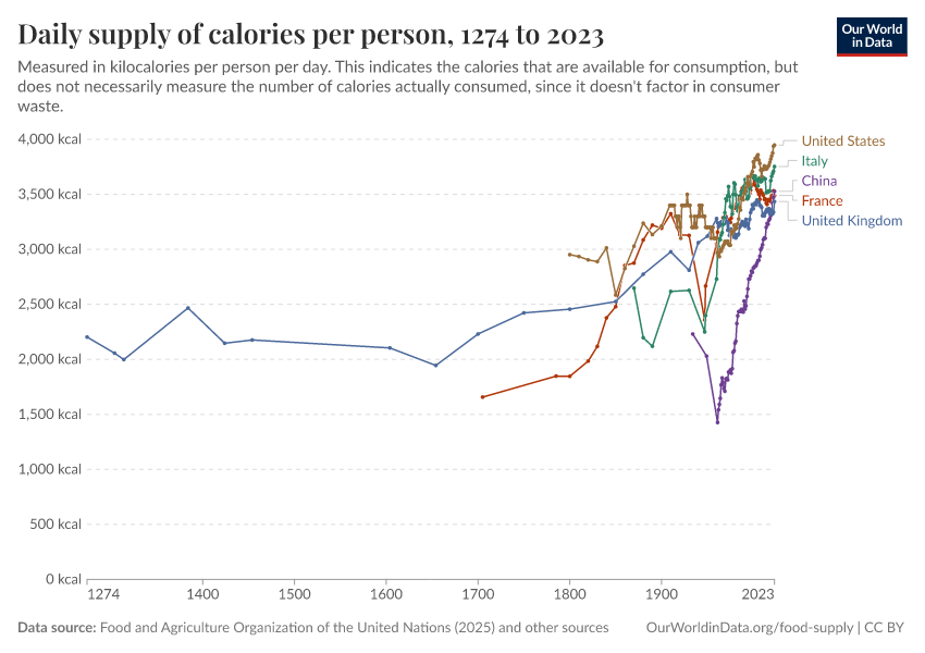 Max Roser, Hannah Ritchie, and Pablo Rosado (2013) - “Food Supply” Published online at OurWorldinData.org. Retrieved from: 'https://add-force-datapage.owid.pages.dev/food-supply' [Online Resource]BibTeX citation