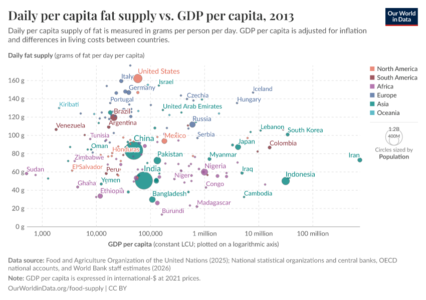 Per capita food supply therefore tends to increase with economic growth. However, this trend tends to taper off or even reverse in high-income countries.