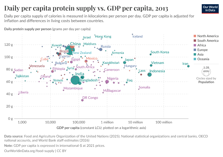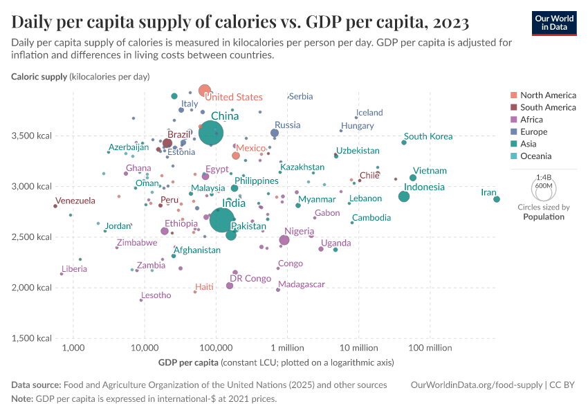 In the sub-sections below we have plotted the relationship between daily per capita food supply (in the form of calories, protein, and then fat) versus gross domestic product (GDP) per capita in 2011 international-$. Several countries selected across a range of income levels and global regions have been highlighted for comparison. For all three measures of food supply, we see a close correlation between per capita supply and prosperity. As we get richer, per capita supply tends to increase.