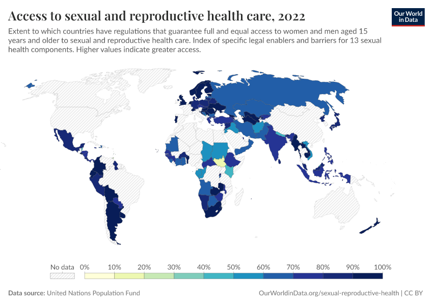 “Data Page: Access to sexual and reproductive health care”. Our World in Data (2026). Data adapted from United Nations Population Fund. Retrieved from https://add-force-datapage.owid.pages.dev/grapher/access-to-sexual-health-care-and-education [online resource]How to cite this data