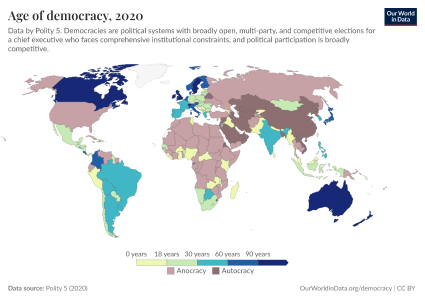 “Data Page: Age of democracy”, part of the following publication: Bastian Herre, Lucas Rodés-Guirao, and Esteban Ortiz-Ospina (2013) - “Democracy”. Data adapted from Polity 5. Retrieved from https://add-force-datapage.owid.pages.dev/grapher/age-of-democracy-polity [online resource]How to cite this data