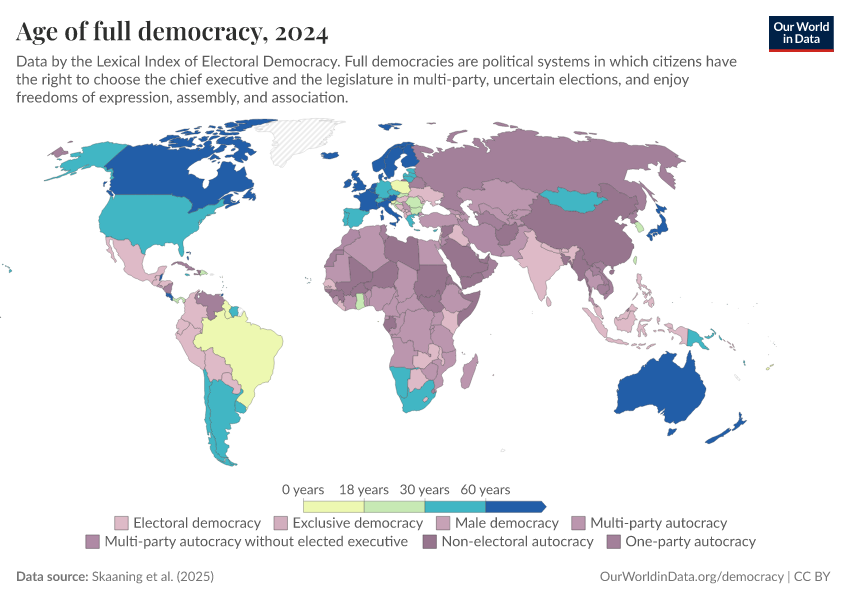 Skaaning et al. (2025) – processed by Our World in Data. “Age of full democracy” [dataset]. Skaaning et al., “Lexical Index of Electoral Democracy (LIED) v6.8” [original data]. Retrieved March 2, 2026 from https://add-force-datapage.owid.pages.dev/grapher/age-of-full-democracy