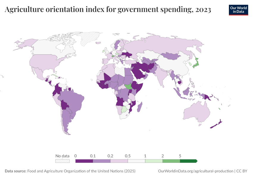 Food and Agriculture Organization of the United Nations (2025) – with major processing by Our World in Data. “2.a.1 agriculture orientation index for government expenditures - Value () – UN FAO” [dataset]. Food and Agriculture Organization of the United Nations, “SDG Indicators” [original data]. Retrieved March 2, 2026 from https://add-force-datapage.owid.pages.dev/grapher/agriculture-orientation-index