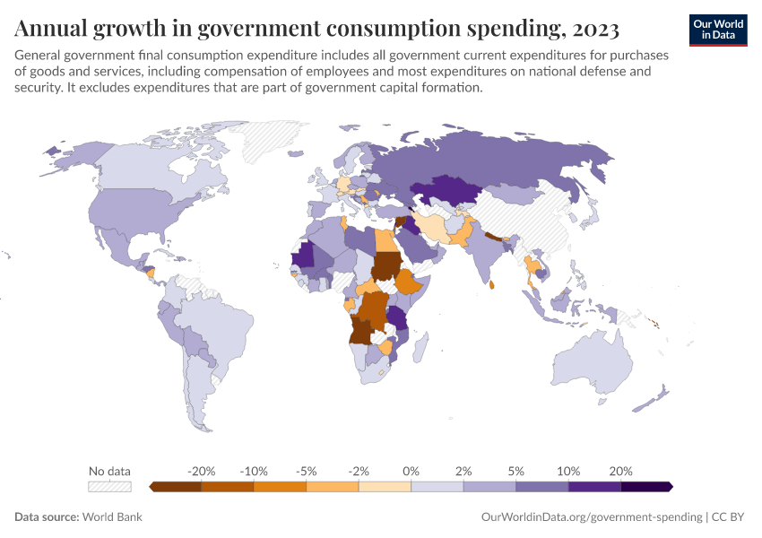 “Data Page: Annual growth in government consumption spending”. Our World in Data (2026). Data adapted from World Bank. Retrieved from https://add-force-datapage.owid.pages.dev/grapher/annual-growth-of-general-government-final-consumption-expenditure [online resource]How to cite this data