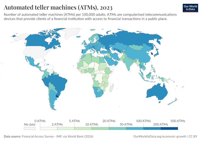 “Data Page: Automated teller machines (ATMs)”. Our World in Data (2026). Data adapted from Financial Access Survey - IMF, via World Bank. Retrieved from https://add-force-datapage.owid.pages.dev/grapher/automated-teller-machines-atms-per-100000-adults [online resource]How to cite this data