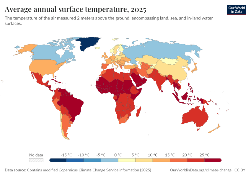 Contains modified Copernicus Climate Change Service information (2025) – with major processing by Our World in Data. “Average annual surface temperature” [dataset]. Contains modified Copernicus Climate Change Service information, “ERA5 monthly averaged data on single levels from 1940 to present 2” [original data]. Retrieved March 2, 2026 from https://add-force-datapage.owid.pages.dev/grapher/average-annual-surface-temperature