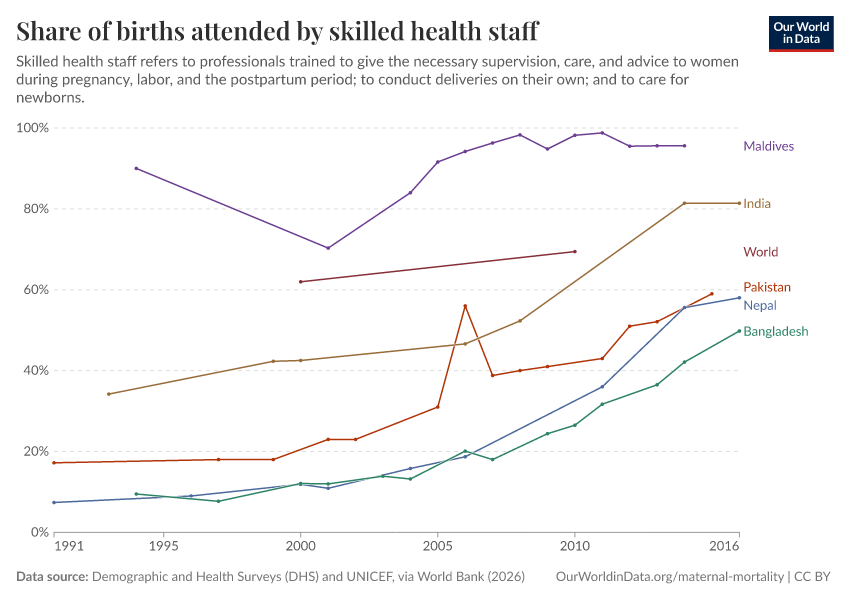 Demographic and Health Surveys (DHS) and UNICEF, via World Bank (2026) – processed by Our World in Data. “Share of births attended by skilled health staff” [dataset]. Demographic and Health Surveys (DHS) and UNICEF, via World Bank, “World Development Indicators 125” [original data]. Retrieved March 2, 2026 from https://add-force-datapage.owid.pages.dev/grapher/births-attended-by-health-staff-sdgs