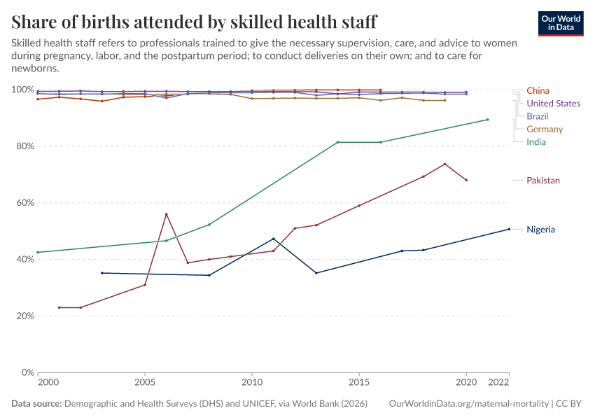 Demographic and Health Surveys (DHS) and UNICEF, via World Bank (2026) – processed by Our World in Data. “Share of births attended by skilled health staff” [dataset]. Demographic and Health Surveys (DHS) and UNICEF, via World Bank, “World Development Indicators 125” [original data]. Retrieved March 2, 2026 from https://add-force-datapage.owid.pages.dev/grapher/births-attended-by-health-staff-sdgs