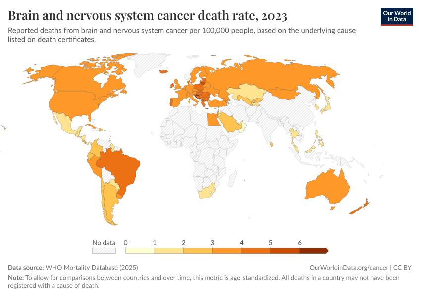 WHO Mortality Database (2025) – with minor processing by Our World in Data. “Brain and nervous system cancer death rate” [dataset]. WHO Mortality Database, “WHO Mortality Database” [original data]. Retrieved March 2, 2026 from https://add-force-datapage.owid.pages.dev/grapher/brain-and-nervous-system-cancer-death-rate
