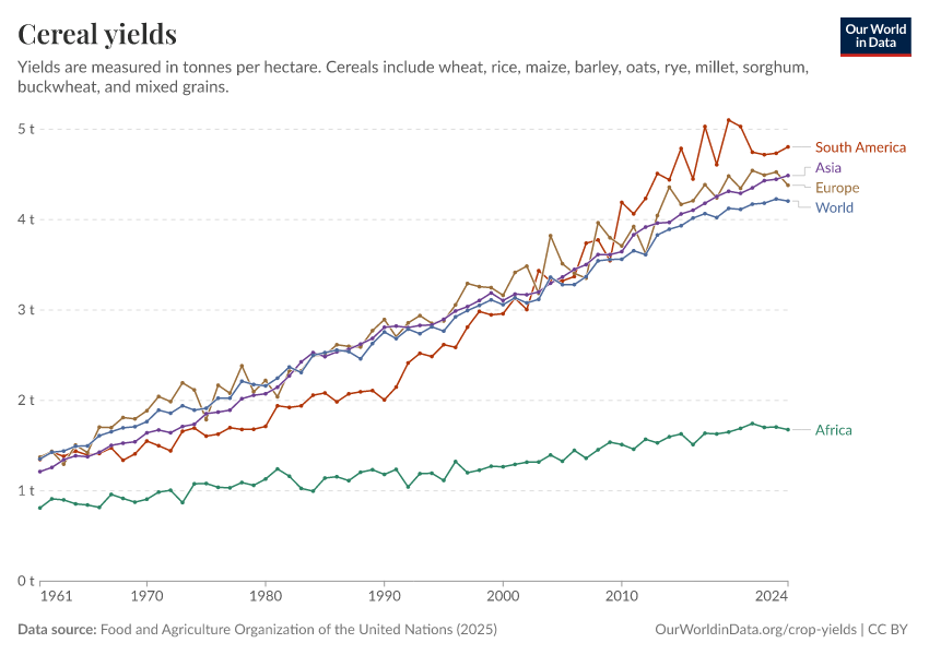Food and Agriculture Organization of the United Nations (2025) – with major processing by Our World in Data. “Cereal yields – UN FAO” [dataset]. Food and Agriculture Organization of the United Nations, “Production: Crops and livestock products” [original data]. Retrieved March 2, 2026 from https://add-force-datapage.owid.pages.dev/grapher/cereal-yield