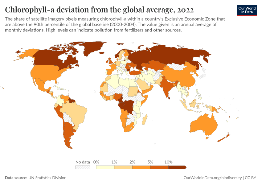“Data Page: Chlorophyll-a deviation from the global average”. Our World in Data (2026). Data adapted from UN Statistics Division. Retrieved from https://add-force-datapage.owid.pages.dev/grapher/chlorophyll-a-deviation-from-the-global-average [online resource]How to cite this data