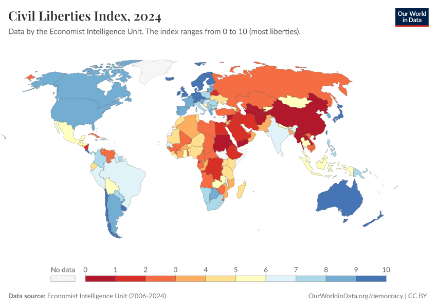 Economist Intelligence Unit (2006-2024) – processed by Our World in Data. “Civil Liberties Index” [dataset]. Economist Intelligence Unit, “Democracy Index 2021: The China challenge”; Economist Intelligence Unit, “Democracy Index 2022: Frontline democracy and the battle for Ukraine”; Economist Intelligence Unit, “Democracy Index 2023: Age of Conflict”; Economist Intelligence Unit, “Democracy Index 2024: What's wrong with representative democracy?”; Gapminder, “Democracy Index v4”; Various sources, “Population” [original data]. Retrieved March 2, 2026 from https://add-force-datapage.owid.pages.dev/grapher/civil-liberties-index-eiu