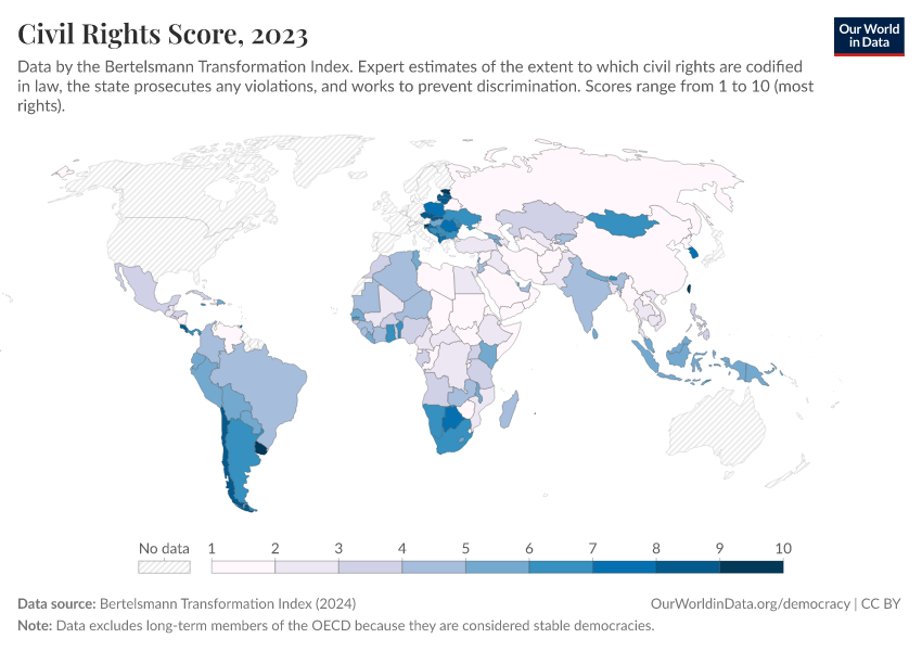 Bertelsmann Transformation Index (2024) – processed by Our World in Data. “Civil Rights Score” [dataset]. Bertelsmann Transformation Index, “Bertelsmann Transformation Index, Scores” [original data]. Retrieved March 2, 2026 from https://add-force-datapage.owid.pages.dev/grapher/civil-rights-score-bti
