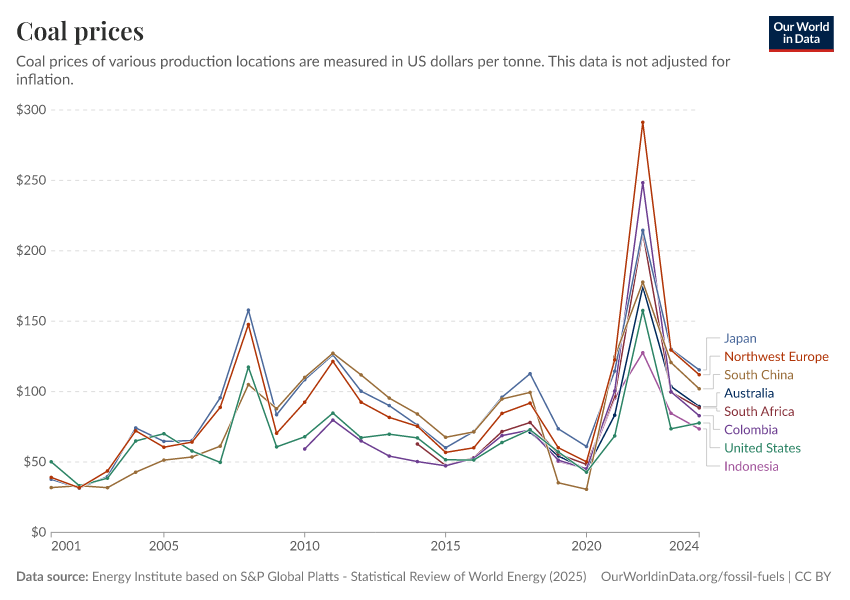 Energy Institute based on S&P Global Platts - Statistical Review of World Energy (2025) – with major processing by Our World in Data. “Coal prices” [dataset]. Energy Institute, “Statistical Review of World Energy” [original data]. Retrieved March 2, 2026 from https://add-force-datapage.owid.pages.dev/grapher/coal-prices