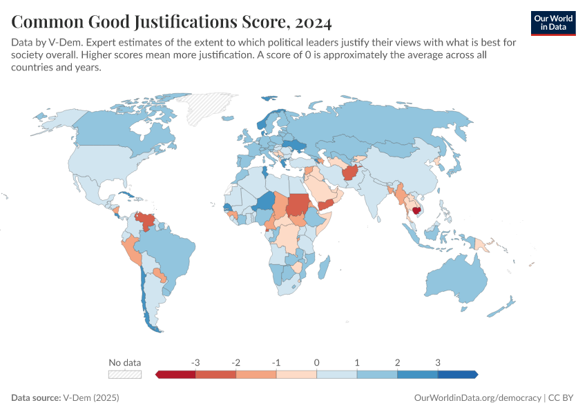 “Data Page: Common good justifications”, part of the following publication: Bastian Herre, Lucas Rodés-Guirao, and Esteban Ortiz-Ospina (2013) - “Democracy”. Data adapted from V-Dem. Retrieved from https://add-force-datapage.owid.pages.dev/grapher/common-good-justifications-score [online resource]How to cite this data