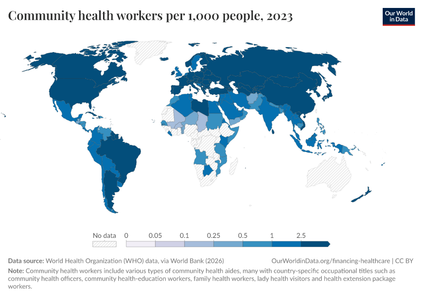 “Data Page: Community health workers per 1,000 people”. Our World in Data (2026). Data adapted from World Health Organization (Global Health Workforce Statistics), OECD, and country data, via World Bank. Retrieved from https://add-force-datapage.owid.pages.dev/grapher/community-health-workers [online resource]How to cite this data