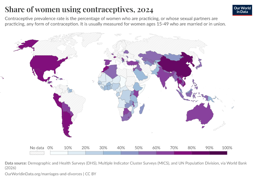 Demographic and Health Surveys (DHS), Multiple Indicator Cluster Surveys (MICS), and UN Population Division, via World Bank (2026) – processed by Our World in Data. “Share of women using contraceptives” [dataset]. Demographic and Health Surveys (DHS), Multiple Indicator Cluster Surveys (MICS), and UN Population Division, via World Bank, “World Development Indicators 125” [original data]. Retrieved March 2, 2026 from https://add-force-datapage.owid.pages.dev/grapher/contraceptive-prevalence-any-methods-of-women-ages-15-49