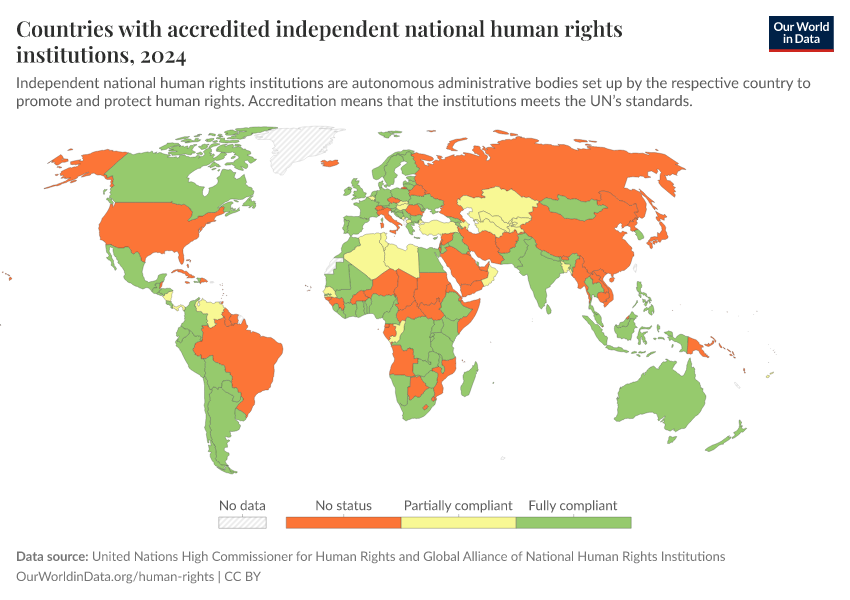 “Data Page: Countries with accredited independent national human rights institutions”. Our World in Data (2026). Data adapted from United Nations High Commissioner for Human Rights and Global Alliance of National Human Rights Institutions. Retrieved from https://add-force-datapage.owid.pages.dev/grapher/countries-with-independent-national-human-rights-institution [online resource]How to cite this data
