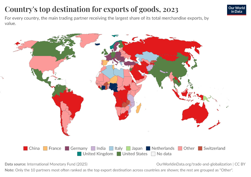 International Monetary Fund (2025) – with major processing by Our World in Data. “Top export partner category” [dataset]. International Monetary Fund, “International Trade in Goods (by partner country) (IMTS)” [original data]. Retrieved March 2, 2026 from https://add-force-datapage.owid.pages.dev/grapher/countrys-top-destination-for-exports-of-goods