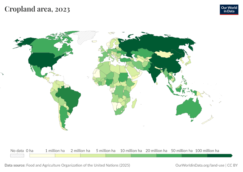 “Data Page: Cropland area”, part of the following publication: Hannah Ritchie, Pablo Rosado, and Max Roser (2023) - “Agricultural Production”. Data adapted from Food and Agriculture Organization of the United Nations. Retrieved from https://add-force-datapage.owid.pages.dev/grapher/cropland-area [online resource]