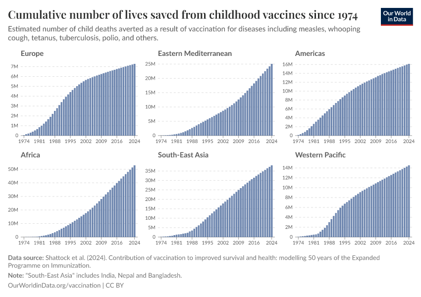 “Data Page: Cumulative number of lives saved from childhood vaccines since 1974”. Our World in Data (2026). Data adapted from Shattock et al. (2024). Contribution of vaccination to improved survival and health: modelling 50 years of the Expanded Programme on Immunization.. Retrieved from https://add-force-datapage.owid.pages.dev/grapher/cumulative-lives-saved-vaccination [online resource]How to cite this data