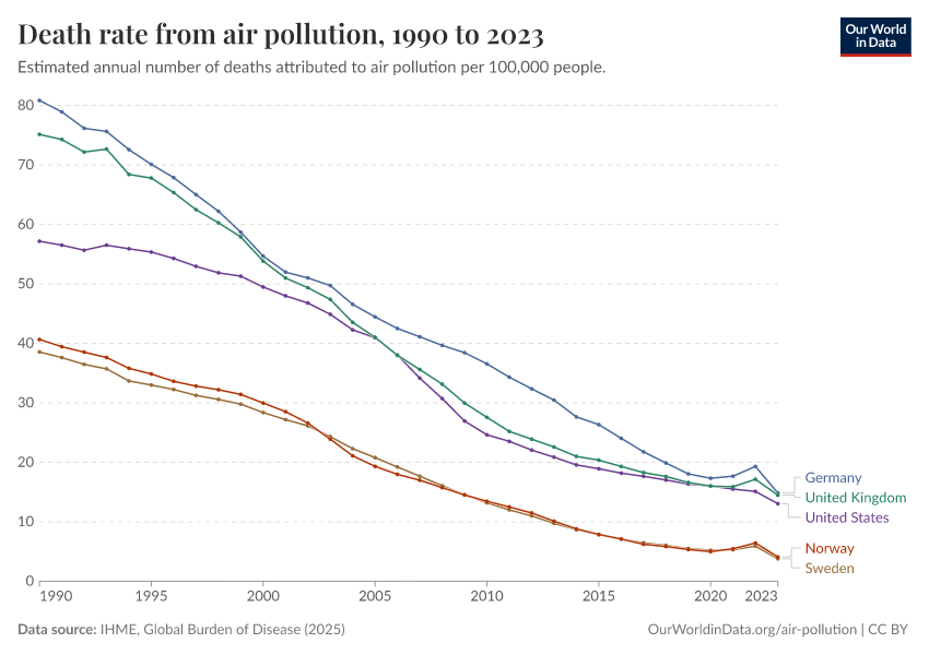 IHME, Global Burden of Disease (2025) – with major processing by Our World in Data. “Death rate from air pollution” [dataset]. IHME, Global Burden of Disease, “Global Burden of Disease - Risk Factors - Deaths” [original data]. Retrieved March 2, 2026 from https://add-force-datapage.owid.pages.dev/grapher/death-rate-from-air-pollution-per-100000