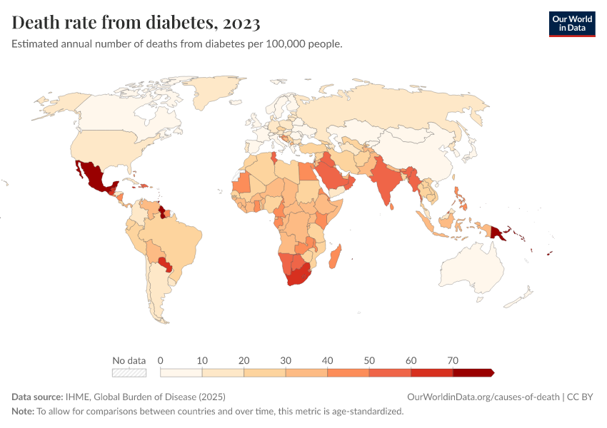 IHME, Global Burden of Disease (2025) – with major processing by Our World in Data. “Death rate from diabetes” [dataset]. IHME, Global Burden of Disease, “Global Burden of Disease - Deaths” [original data]. Retrieved March 2, 2026 from https://add-force-datapage.owid.pages.dev/grapher/death-rate-from-diabetes