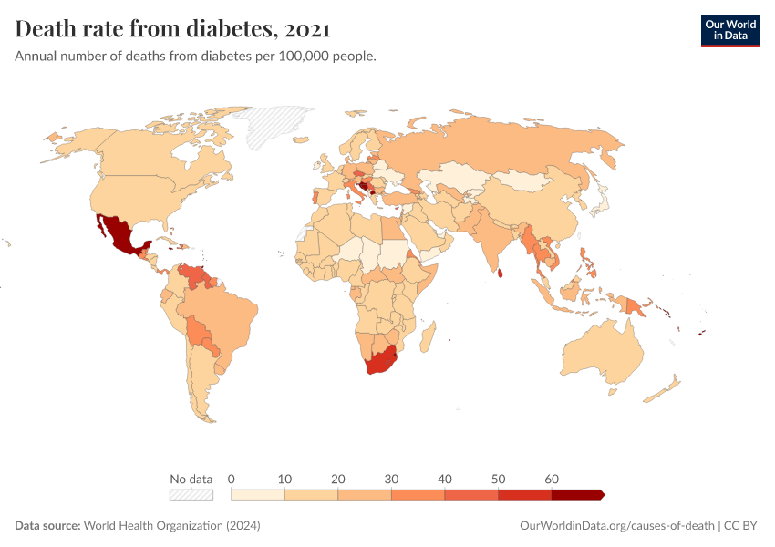 World Health Organization (2024) – with major processing by Our World in Data. “Death rate from diabetes” [dataset]. World Health Organization, “Global Health Estimates” [original data]. Retrieved March 2, 2026 from https://add-force-datapage.owid.pages.dev/grapher/death-rate-from-diabetes-ghe