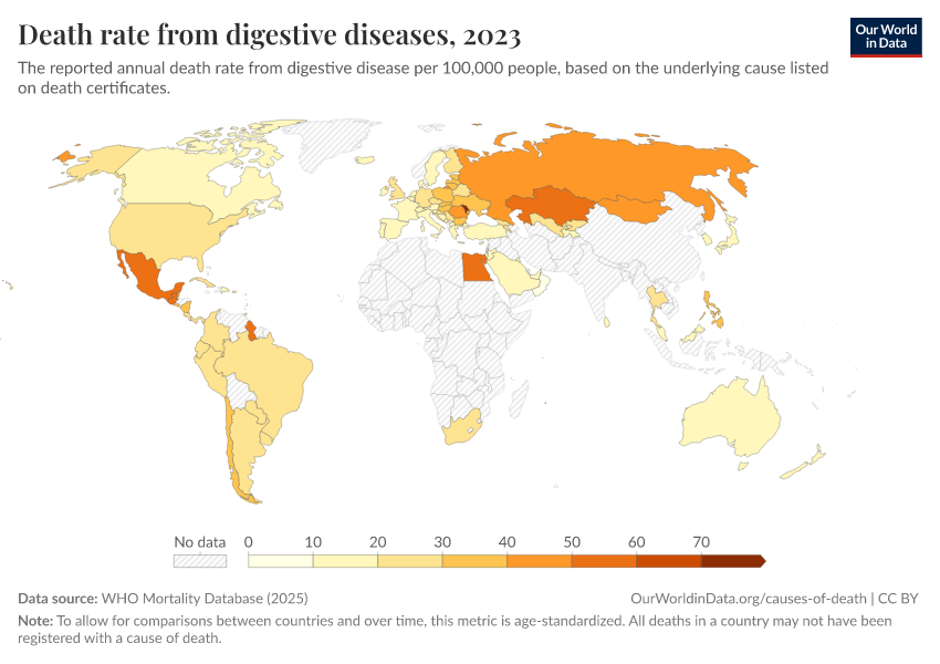 WHO Mortality Database (2025) – with minor processing by Our World in Data. “Death rate from digestive diseases” [dataset]. WHO Mortality Database, “WHO Mortality Database” [original data]. Retrieved March 2, 2026 from https://add-force-datapage.owid.pages.dev/grapher/death-rate-from-digestive-diseases-who-mdb