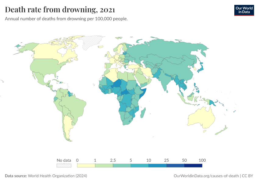 World Health Organization (2024) – with major processing by Our World in Data. “Death rate from drowning” [dataset]. World Health Organization, “Global Health Estimates” [original data]. Retrieved March 2, 2026 from https://add-force-datapage.owid.pages.dev/grapher/death-rate-from-drowning-ghe