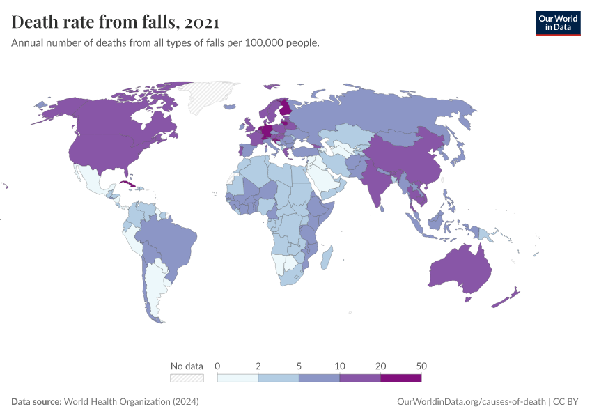 World Health Organization (2024) – with major processing by Our World in Data. “Death rate from falls” [dataset]. World Health Organization, “Global Health Estimates” [original data]. Retrieved March 2, 2026 from https://add-force-datapage.owid.pages.dev/grapher/death-rate-from-falls