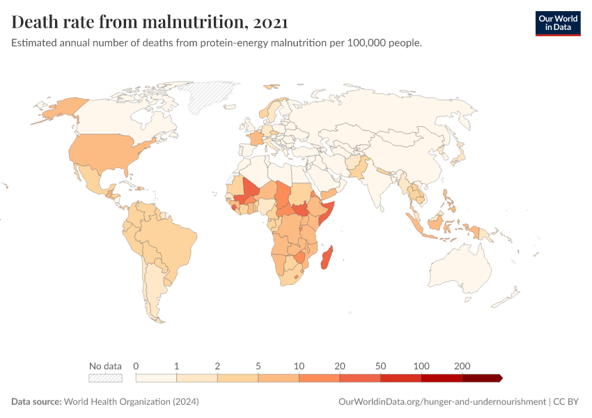 World Health Organization (2024) – with major processing by Our World in Data. “Death rate from malnutrition” [dataset]. World Health Organization, “Global Health Estimates” [original data]. Retrieved March 2, 2026 from https://add-force-datapage.owid.pages.dev/grapher/death-rate-from-malnutrition-ghe