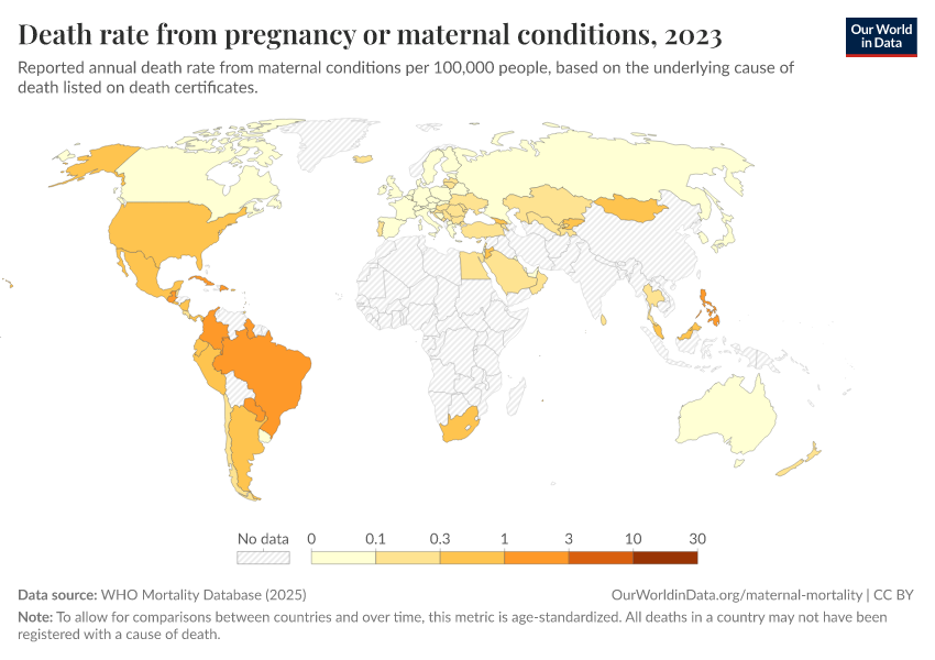 WHO Mortality Database (2025) – with minor processing by Our World in Data. “Death rate from pregnancy or maternal conditions” [dataset]. WHO Mortality Database, “WHO Mortality Database” [original data]. Retrieved March 2, 2026 from https://add-force-datapage.owid.pages.dev/grapher/death-rate-from-maternal-disorders