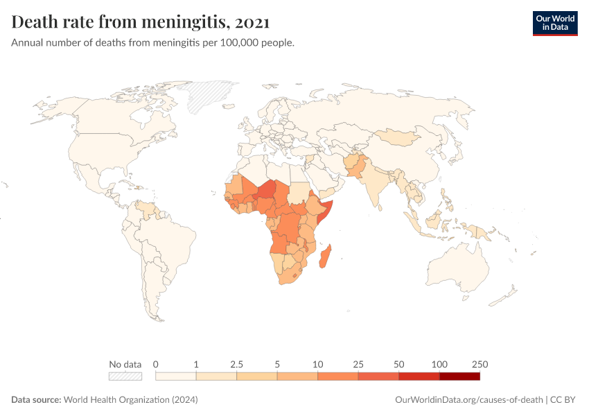 World Health Organization (2024) – with major processing by Our World in Data. “Death rate from meningitis” [dataset]. World Health Organization, “Global Health Estimates” [original data]. Retrieved March 2, 2026 from https://add-force-datapage.owid.pages.dev/grapher/death-rate-from-meningitis-who