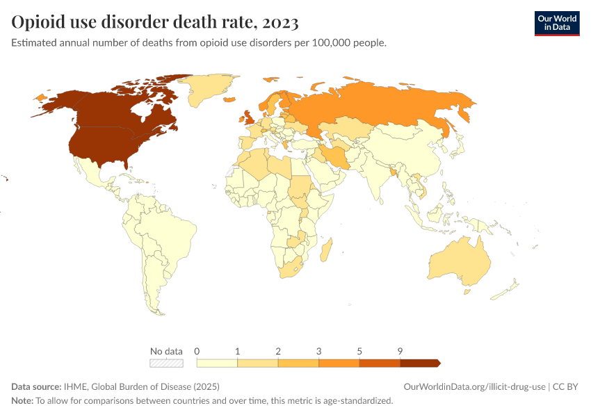 IHME, Global Burden of Disease (2025) – with major processing by Our World in Data. “Opioid use disorder death rate” [dataset]. IHME, Global Burden of Disease, “Global Burden of Disease - Deaths” [original data]. Retrieved March 2, 2026 from https://add-force-datapage.owid.pages.dev/grapher/death-rate-from-opioid-use