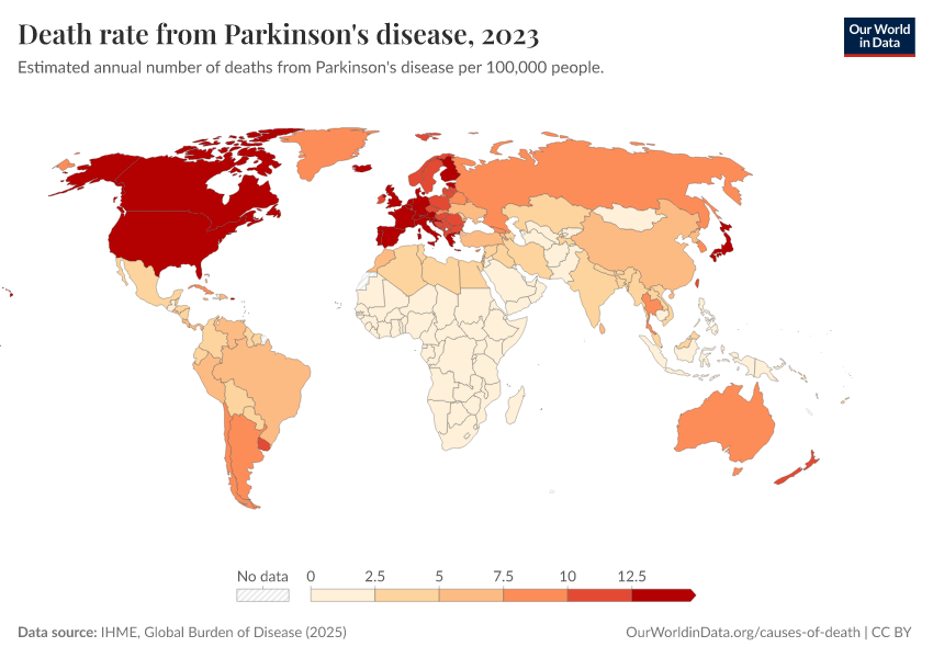 IHME, Global Burden of Disease (2025) – with major processing by Our World in Data. “Death rate from Parkinson's disease” [dataset]. IHME, Global Burden of Disease, “Global Burden of Disease - Deaths” [original data]. Retrieved March 2, 2026 from https://add-force-datapage.owid.pages.dev/grapher/death-rate-from-parkinsons-disease-gbd