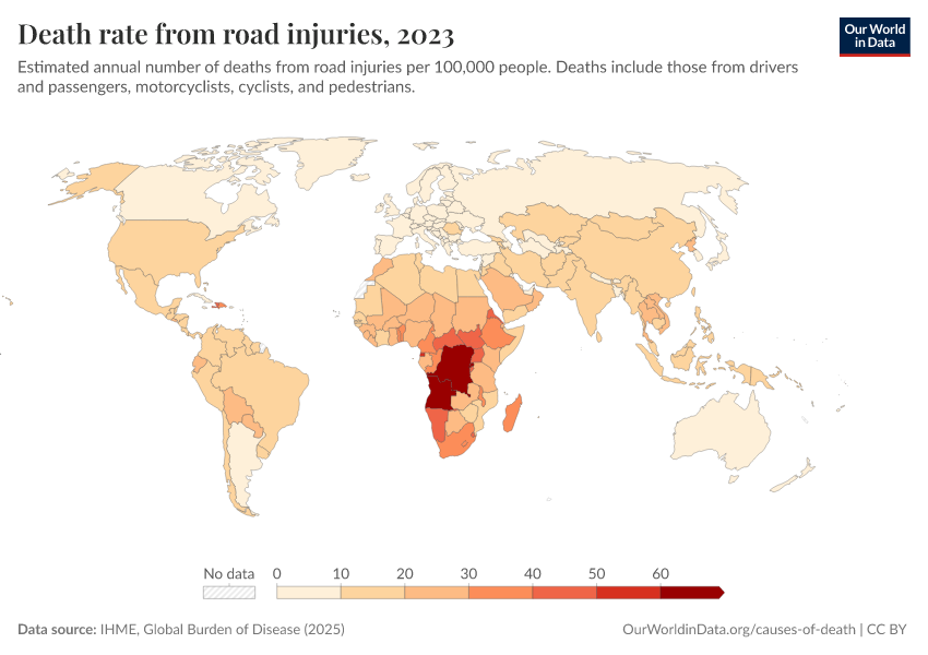 IHME, Global Burden of Disease (2025) – with major processing by Our World in Data. “Death rate from road injuries” [dataset]. IHME, Global Burden of Disease, “Global Burden of Disease - Deaths” [original data]. Retrieved March 2, 2026 from https://add-force-datapage.owid.pages.dev/grapher/death-rate-from-road-accidents