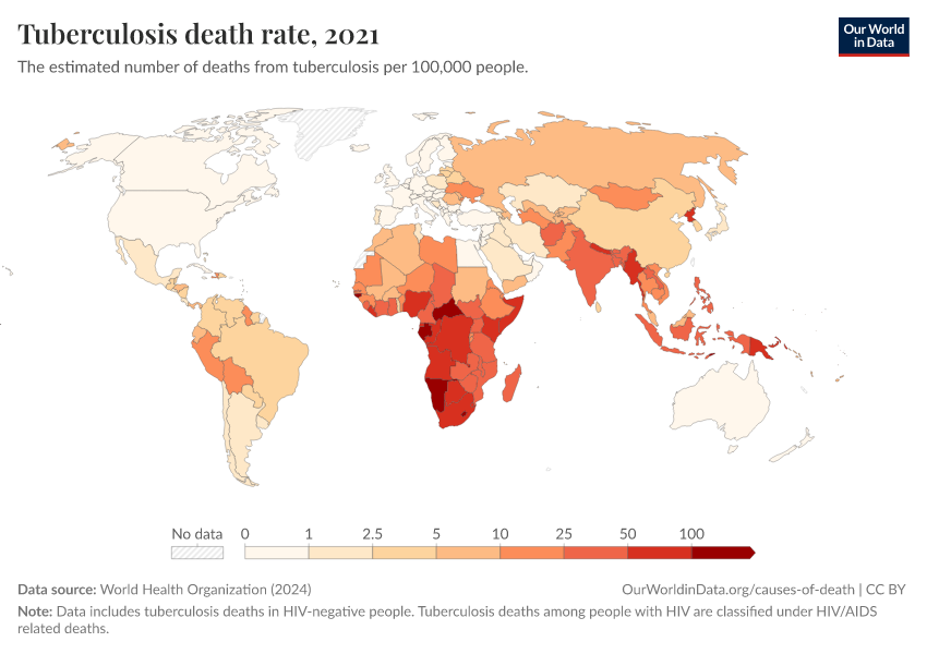 World Health Organization (2024) – with major processing by Our World in Data. “Tuberculosis death rate” [dataset]. World Health Organization, “Global Health Estimates” [original data]. Retrieved March 2, 2026 from https://add-force-datapage.owid.pages.dev/grapher/death-rate-from-tuberculosis-ghe