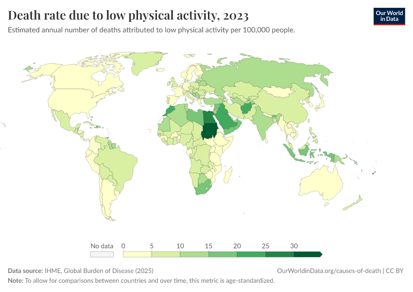 IHME, Global Burden of Disease (2025) – with major processing by Our World in Data. “Death rate due to low physical activity” [dataset]. IHME, Global Burden of Disease, “Global Burden of Disease - Risk Factors - Deaths” [original data]. Retrieved March 2, 2026 from https://add-force-datapage.owid.pages.dev/grapher/death-rates-due-to-low-physical-activity