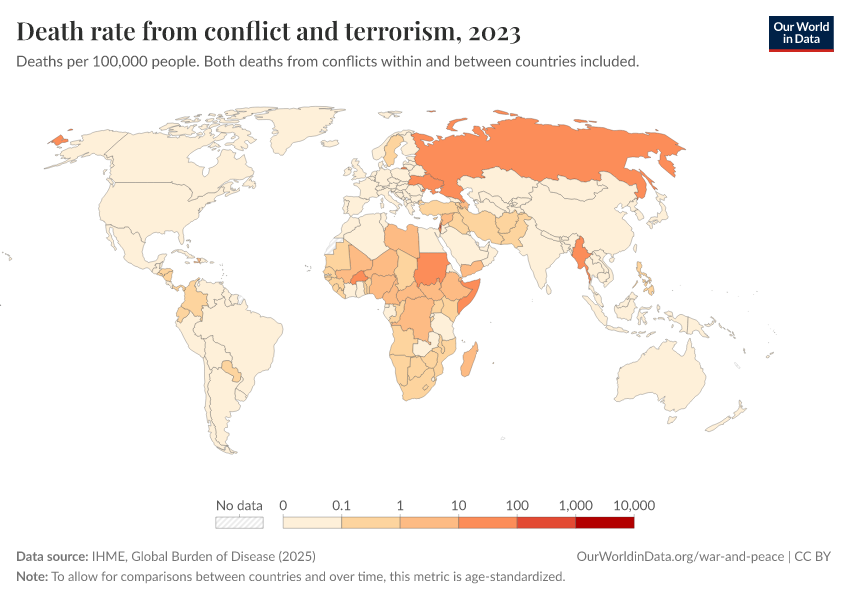 IHME, Global Burden of Disease (2025) – with major processing by Our World in Data. “Death rate from conflict and terrorism” [dataset]. IHME, Global Burden of Disease, “Global Burden of Disease - Deaths” [original data]. Retrieved March 2, 2026 from https://add-force-datapage.owid.pages.dev/grapher/death-rates-from-conflict-and-terrorism-gbd