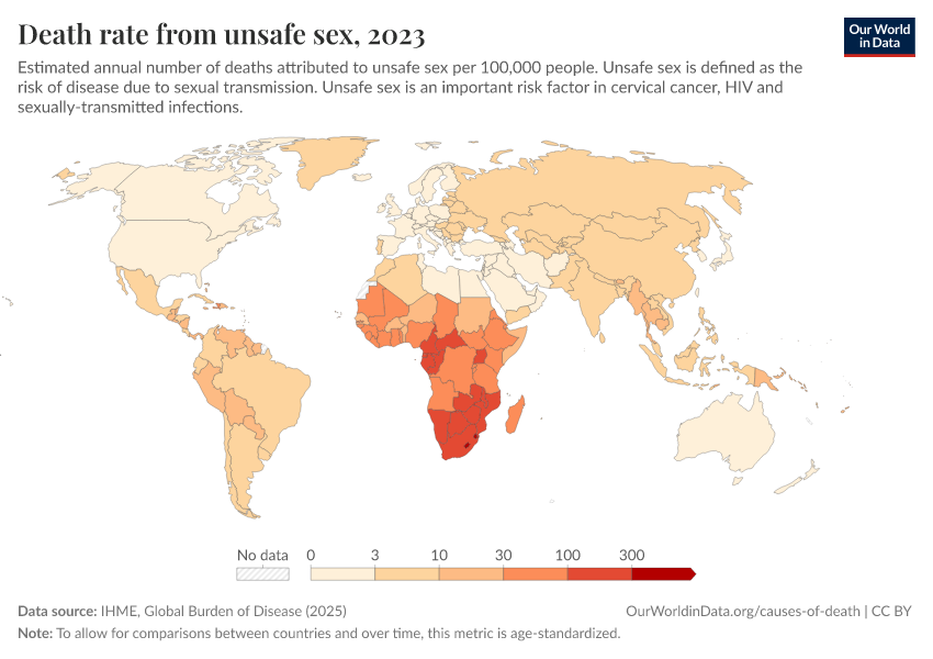 IHME, Global Burden of Disease (2025) – with major processing by Our World in Data. “Death rate from unsafe sex” [dataset]. IHME, Global Burden of Disease, “Global Burden of Disease - Risk Factors - Deaths” [original data]. Retrieved March 2, 2026 from https://add-force-datapage.owid.pages.dev/grapher/death-rates-from-unsafe-sex
