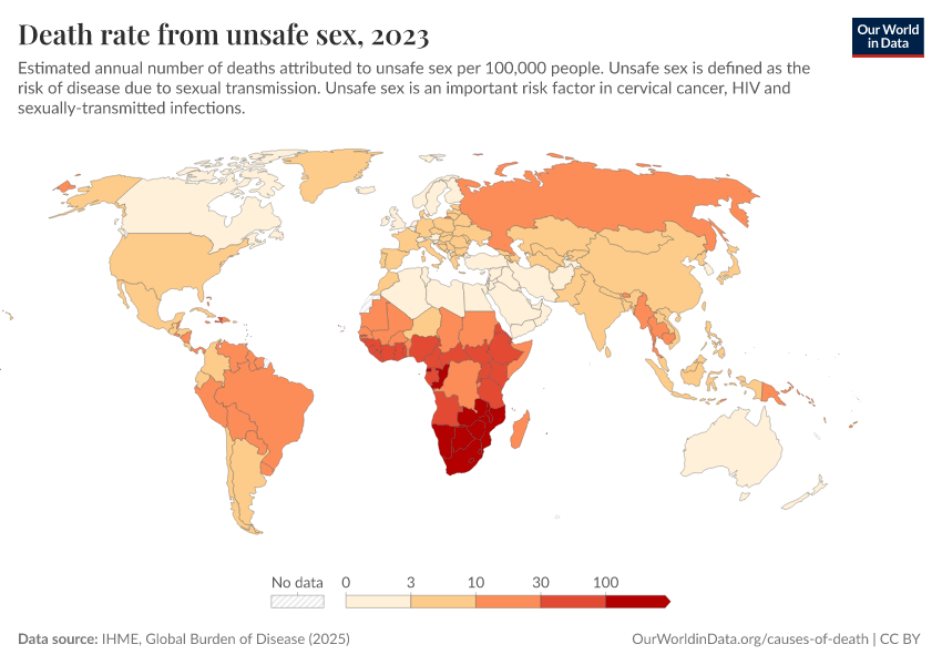 IHME, Global Burden of Disease (2025) – with major processing by Our World in Data. “Death rate from unsafe sex” [dataset]. IHME, Global Burden of Disease, “Global Burden of Disease - Risk Factors - Deaths” [original data]. Retrieved March 2, 2026 from https://add-force-datapage.owid.pages.dev/grapher/death-rates-from-unsafe-sex-gbd