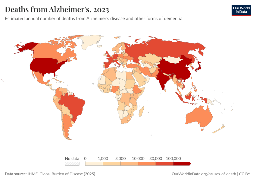 IHME, Global Burden of Disease (2025) – with major processing by Our World in Data. “Deaths from Alzheimer's” [dataset]. IHME, Global Burden of Disease, “Global Burden of Disease - Deaths” [original data]. Retrieved March 2, 2026 from https://add-force-datapage.owid.pages.dev/grapher/deaths-from-alzheimers