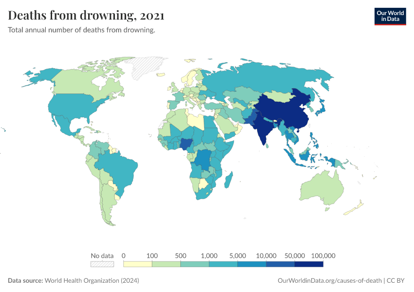 World Health Organization (2024) – with major processing by Our World in Data. “Deaths from drowning” [dataset]. World Health Organization, “Global Health Estimates” [original data]. Retrieved March 2, 2026 from https://add-force-datapage.owid.pages.dev/grapher/deaths-from-drowning-ghe