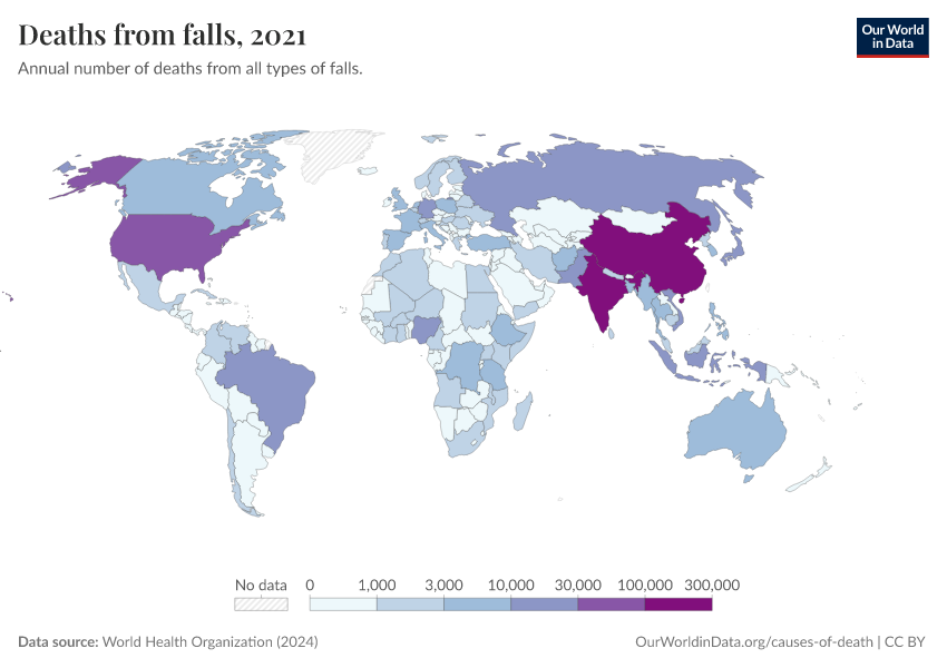 World Health Organization (2024) – with major processing by Our World in Data. “Deaths from falls” [dataset]. World Health Organization, “Global Health Estimates” [original data]. Retrieved March 2, 2026 from https://add-force-datapage.owid.pages.dev/grapher/deaths-from-falls