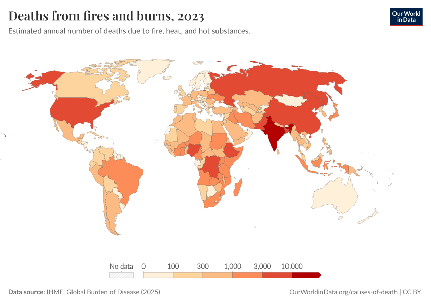 IHME, Global Burden of Disease (2025) – with major processing by Our World in Data. “Deaths from fires and burns” [dataset]. IHME, Global Burden of Disease, “Global Burden of Disease - Deaths” [original data]. Retrieved March 2, 2026 from https://add-force-datapage.owid.pages.dev/grapher/deaths-from-fires-and-burns