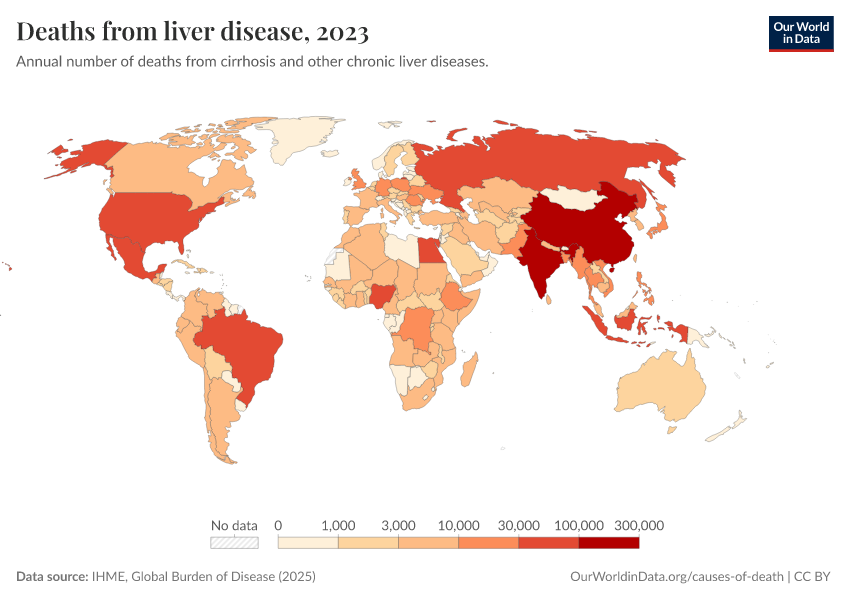 IHME, Global Burden of Disease (2025) – with major processing by Our World in Data. “Deaths from liver disease” [dataset]. IHME, Global Burden of Disease, “Global Burden of Disease - Deaths” [original data]. Retrieved March 2, 2026 from https://add-force-datapage.owid.pages.dev/grapher/deaths-from-liver-disease